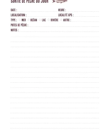 Que vous soyez débutant ou pêcheur confirmé, ce carnet vous aide à suivre vos sorties, progresser et garder une trace unique de vos aventures au bord de l’eau.
