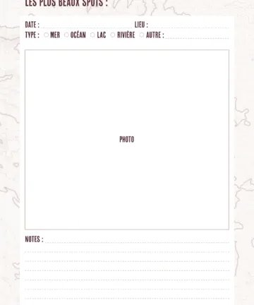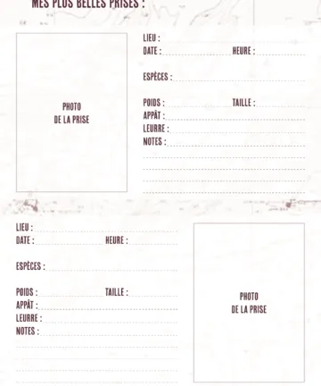 Notez vos plus belles prises, vos spots favoris et vos souvenirs de pêche dans un carnet conçu pour les passionnés.