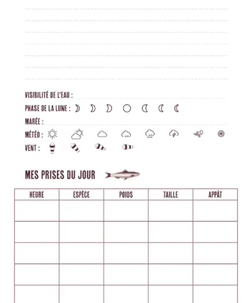 ✔️ Organisation claire : fiches de sortie de pêche, tableaux de prises du jour, espaces de notes et bilans.