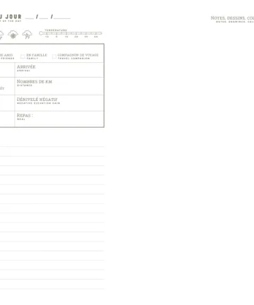 Avec ce carnet, préparez vos itinéraires en toute simplicité. Notez vos étapes, vos kilomètres parcourus, vos hébergements et vos plus belles découvertes. Chaque page devient le reflet de vos sensations, de vos rencontres et des paysages traversés.