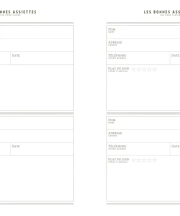 Des pages guidées vous aident à organiser vos bagages, à garder en mémoire vos bonnes adresses et à consigner vos repas ou vos assiettes préférées.